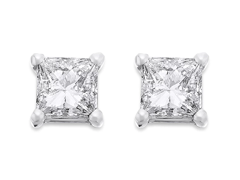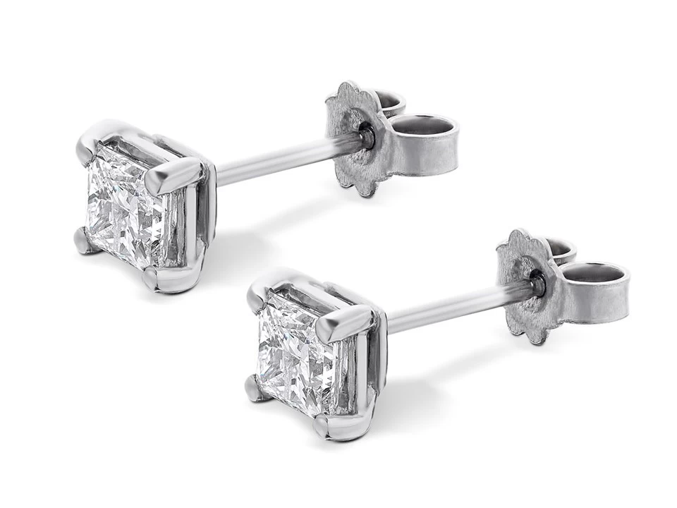 The stunning princess cut diamonds set into these 18ct white gold solitaire earrings are independently graded by the Birmingham Assay Office as colour I and clarity I2. Each stone is personally selected by Andrew Hinds FGA and matched face up to come together as a visually matched pair. Once certificated these are then set by goldsmiths in our UK workshop. 1.01ct total diamond weight for the pair.