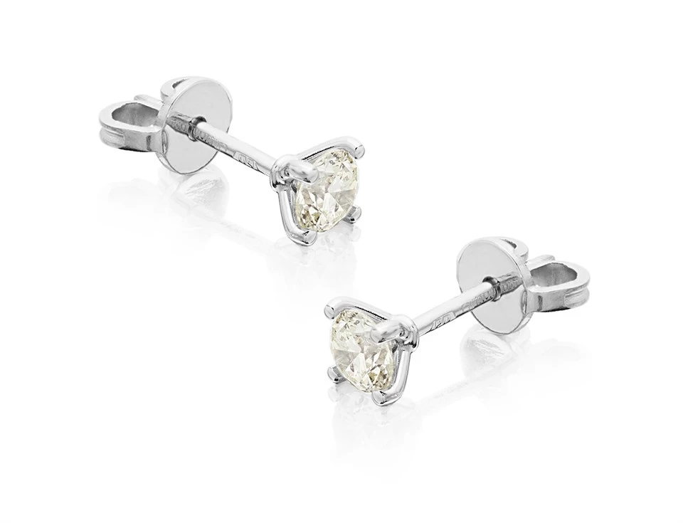 Classic diamond solitaire stud earrings in 18ct white gold. Two, 25pt (0.25ct/1/4ct) round brilliant cut diamonds are set in four claw settings and secured with 18ct white gold butterfly backs. Lovely to have in any jewellery collection. 1/2ct (0.5ct) total diamond weight for the pair.