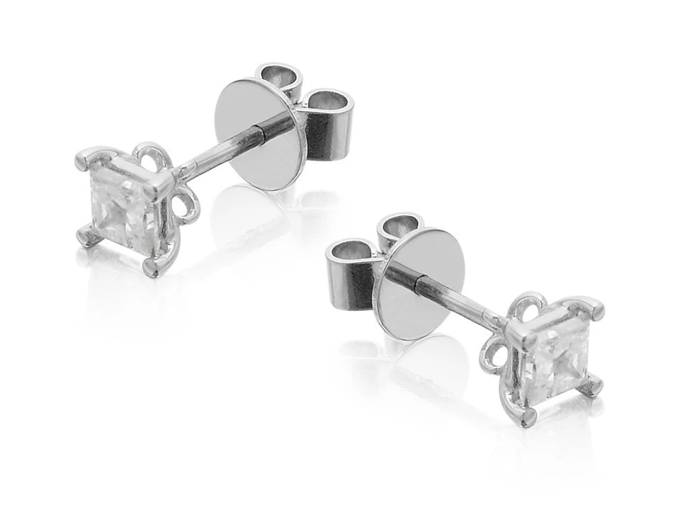 White gold diamond stud earrings that will be loved and admired for a lifetime – two, 3.5mm (approx) princess cut diamond solitaires are set in classic four claw, 18ct white gold settings. Both diamonds have been selected and matched. 1/2ct (minimum) total diamond weight, made in England. Secured with 18ct white gold butterfly scrolls.