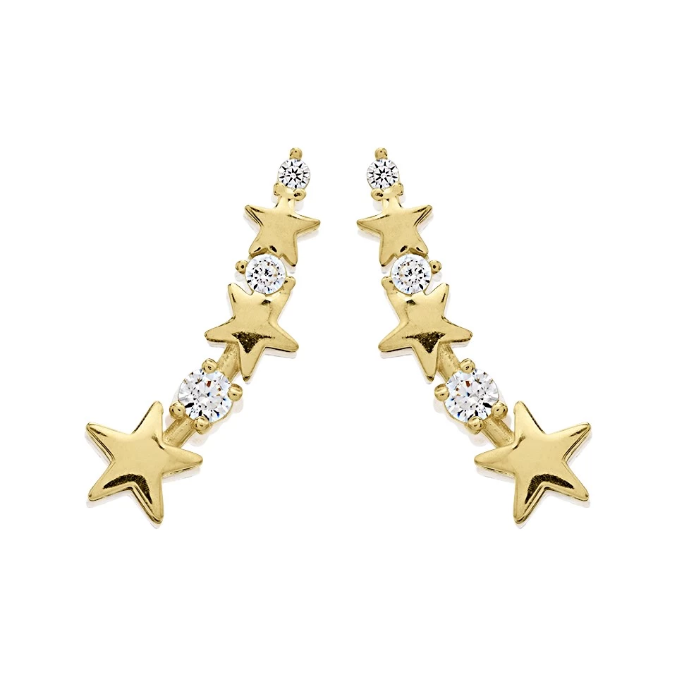 Three stars and three little cubic zirconias in a graduated crawler design create 9ct gold stud earrings to complement any outfit. 15mm in length, finished with gold butterfly backs.