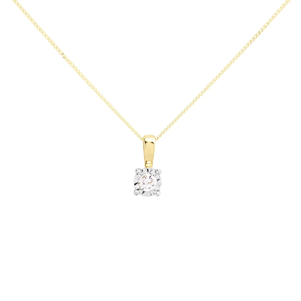 With a 4mm wide illusion setting to enhance the sparkle, the 8pt round brilliant cut diamond set in this 9ct gold pendant offers great value for money. Strung from an 18in/46cm fine gold chain.