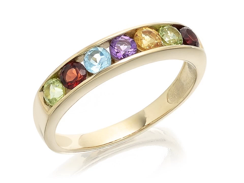 There’s an amethyst, a citrine, two garnets, a blue topaz and two peridots channel set within the 4mm 9ct gold band of this modern and interesting ring. Could be perfect as a commitment or eternity ring, or just because it’s lovely and not so very expensive. Exclusive to F.Hinds in the U.K.