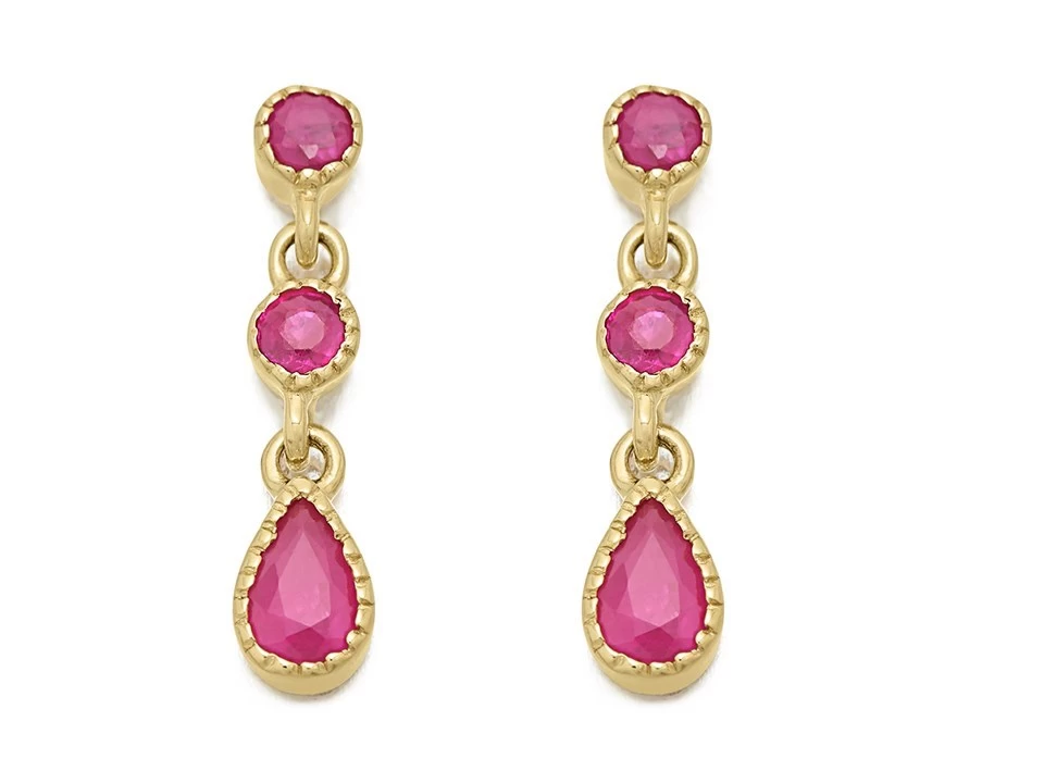 Three red rubies all in a charming ‘pie crust’ setting – two round and one teardrop – together create these full of movement earrings with an 18mm total drop.