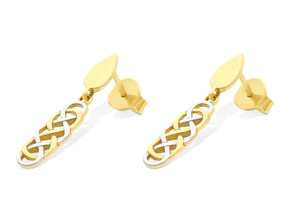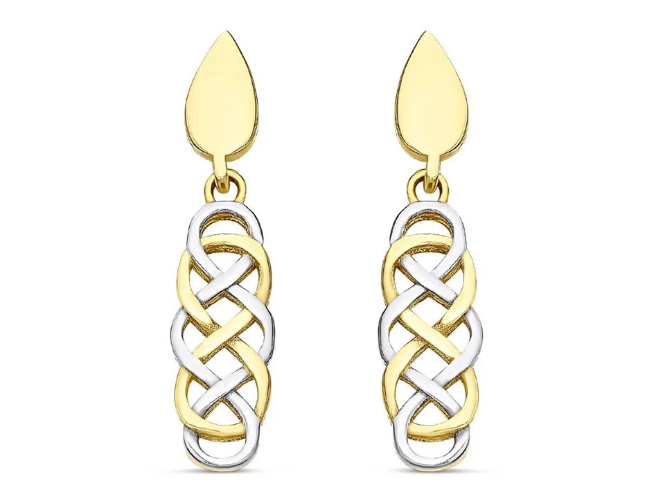 These classic 9ct gold two colour celtic design drop earrings have a drop of 22mm. The two tone lattice pattern will complement any outfit.