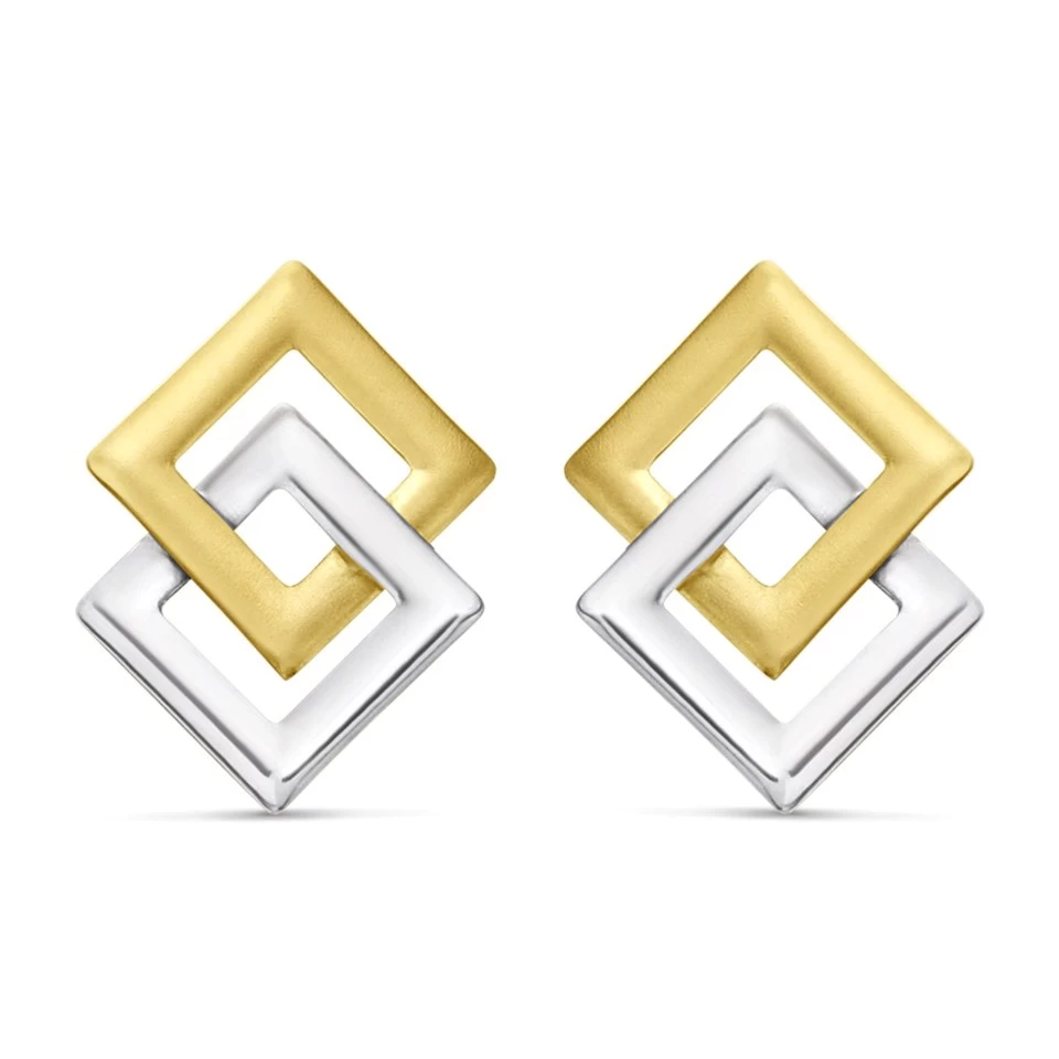 These 9ct gold two colour earrings have geometric, interlocking squares with a polished and matt finish to make these 8mm stud earrings perfect and ever so wearable.