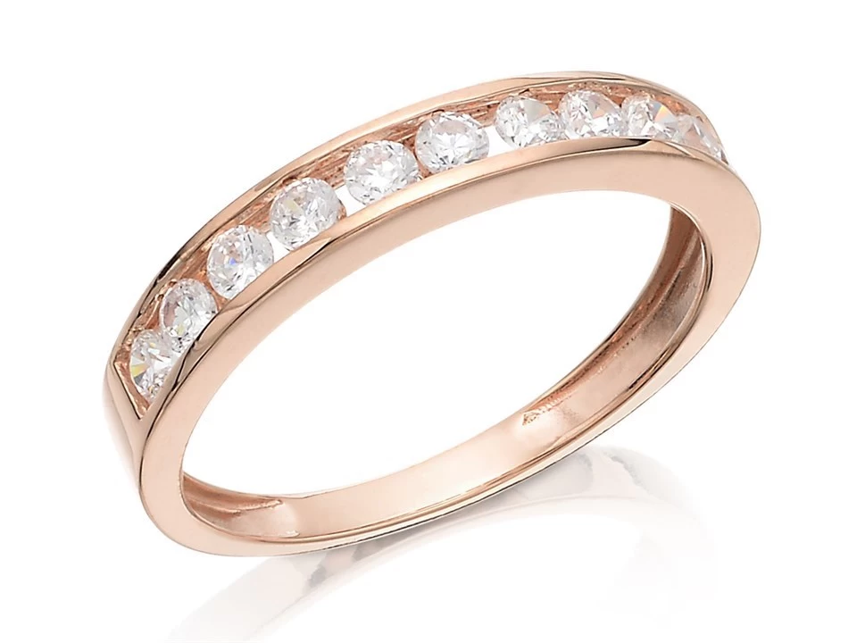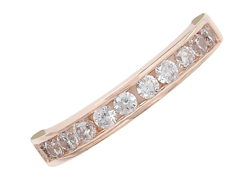 Eleven cubic zirconias are channel set within this stunning 9ct rose gold half eternity ring, perfect for any occasion, at an excellent price. Available in selected sizes only, this rose gold ring cannot be adjusted.