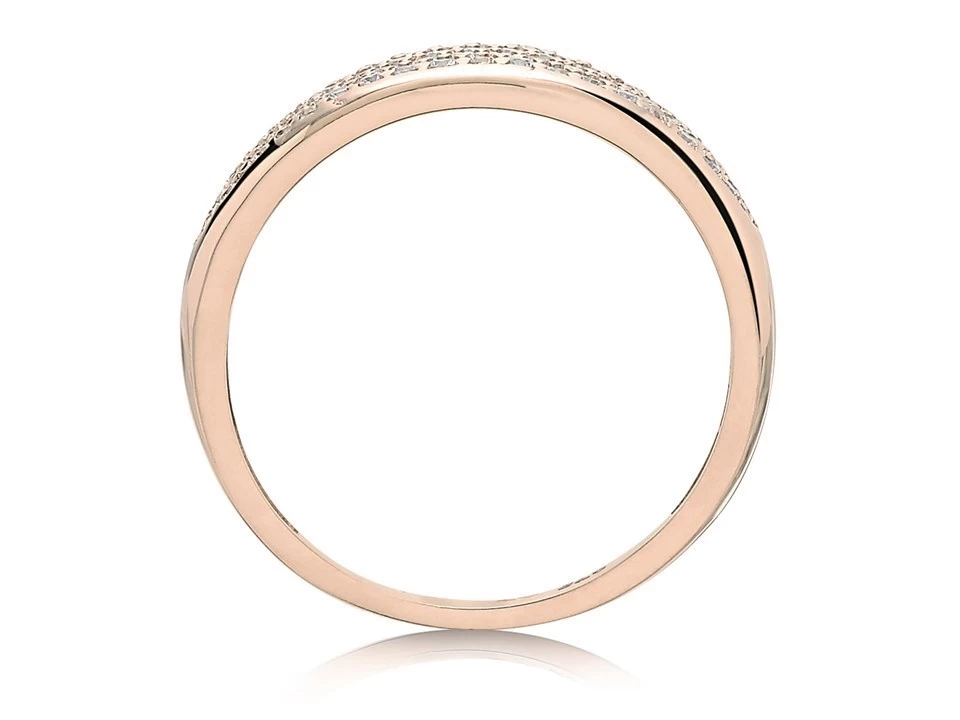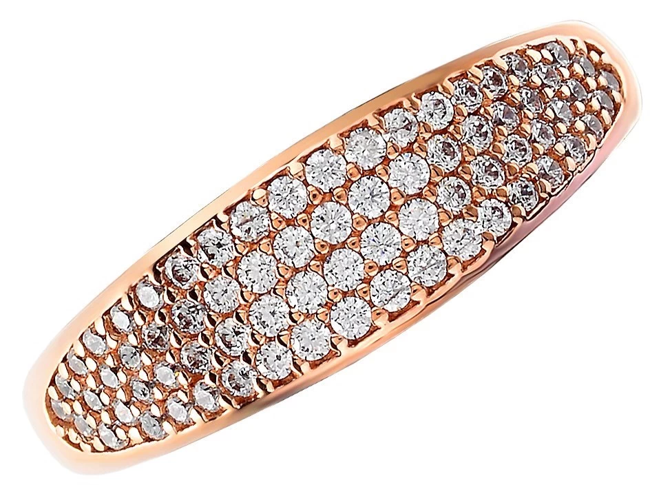 Popular and very contemporary 9ct rose gold for the 2mm band that widens to 6mm for the front face and features four rows of dainty cubic zirconias, tapered at both edges for an attractive and comfortable fit.