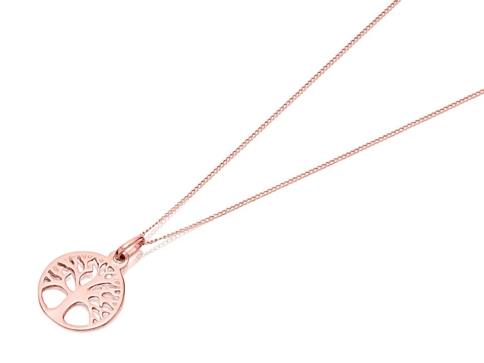 A lovely 12mm F.Hinds tree of life pendant set in 9ct rose gold, strung from an 18″/45.5cm fine rose gold chain. Exclusive to F.Hinds.