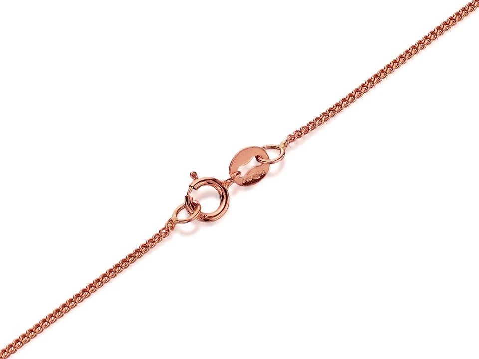 This 9ct rose gold solid curb chain is suitable for lighter weight pendants, or can be worn on its own – measures 18″/45.5cm long x 0.5mm wide.