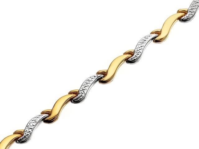Alternate links of polished yellow gold and diamond cut white gold together create this interesting 7.5in/19cm wave link bracelet. Secured with a yellow gold karab clasp.
