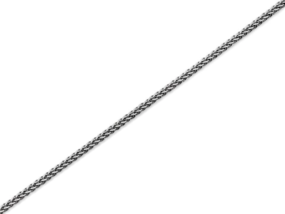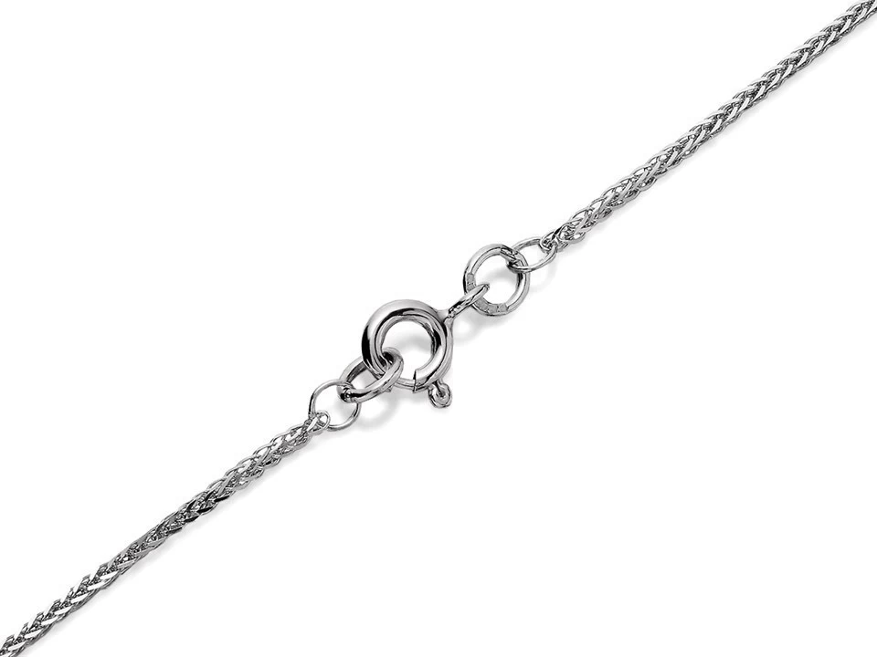 An attractive 18″/45.5cm white gold solid spiga chain with an approximate width of 1mm. Lightweight, it would work well with a pendant or just as good worn singly.