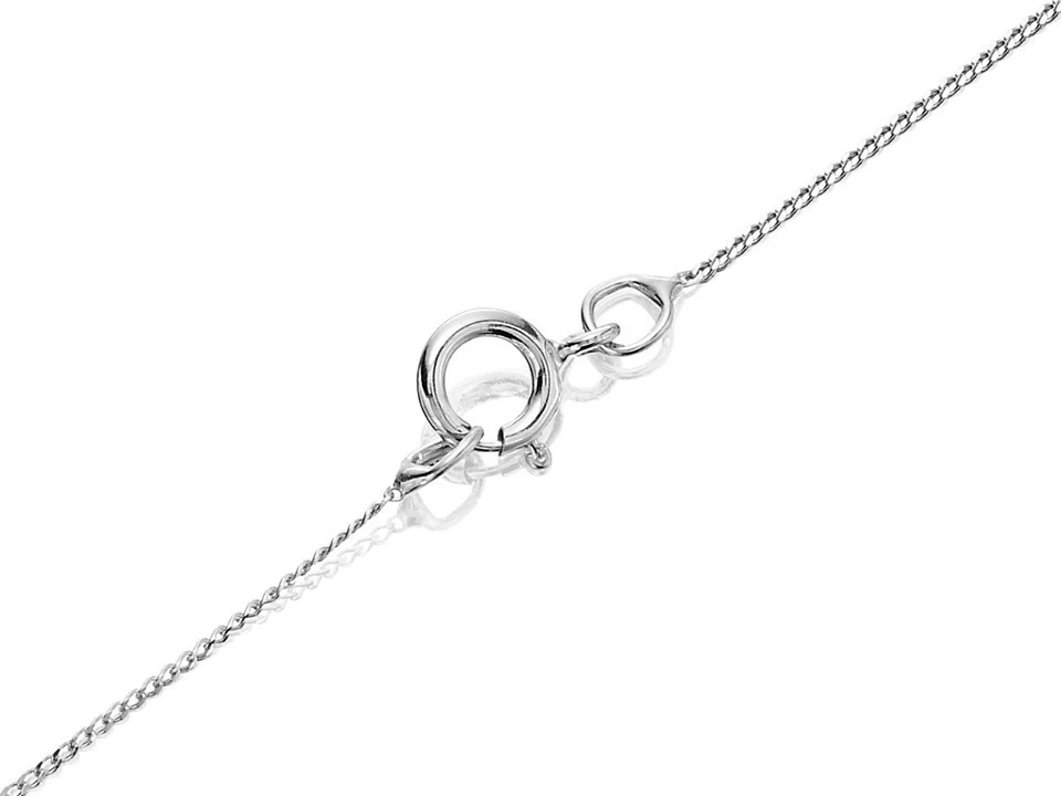 Two fixed, interlinking hearts, the smaller 11mm, the larger 15mm, are both set with cubic zirconias along one of the sides, strung to hang slightly slantwise from an 18″/45.5cm fine white gold chain. A charming and romantic jewellery piece. Exclusive to F.Hinds in the U.K.