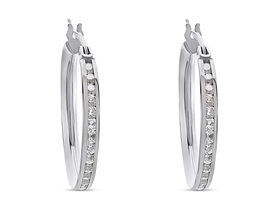 The channel set cubic zirconias add a touch of sparkle to these 15mm wide 9ct white gold hoop earrings. Finished with snap shut fittings.