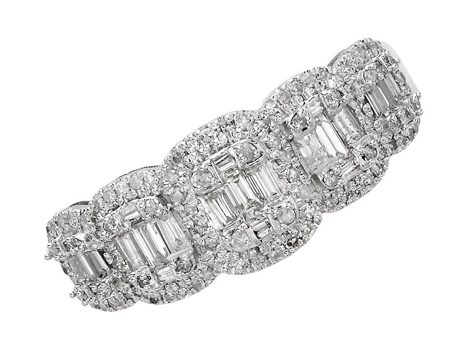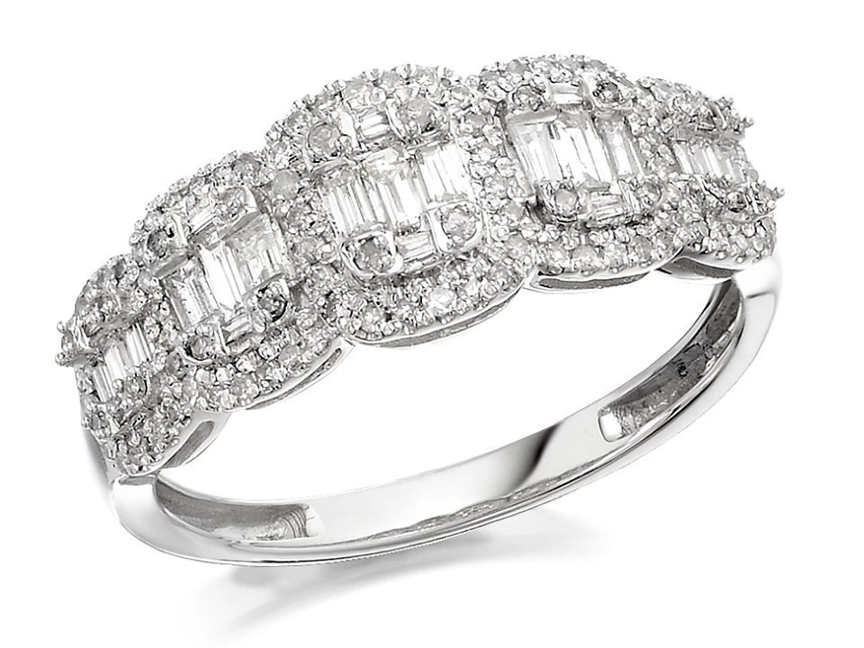 With five, graduated sized cushion shaped clusters, each contain pairs of baguette cut diamonds that are entirely encircled by round brilliant diamonds within a fancy, beaded setting. The head measures 20mm across the finger and 8mm at its widest point. Total diamond weight 1/2ct (0.5ct), available in selected sizes.