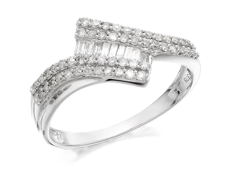 A sparkling white gold ring that not only looks lovely when worn, it is practical also as it lies just 2mm off the finger. Each flowing side boasts two rows of round brilliant cut diamonds and where these crossover, a number of bright baguette cut diamonds lie channel set at the centre. From point to point, the front face measures 10mm wide, total diamond weight 1/3ct (0.33ct/33pts).