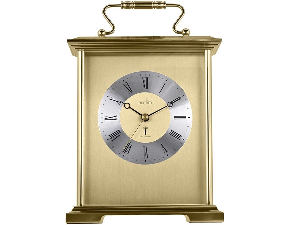 Elegant for any interior, the Althorp carriage clock from Acctim features a radio controlled set up with polished gold tone metal case, handle and glass lens. Finished with black roman numneral hour markers and hands. Measures 20.5 x 14 x 6cm.