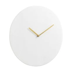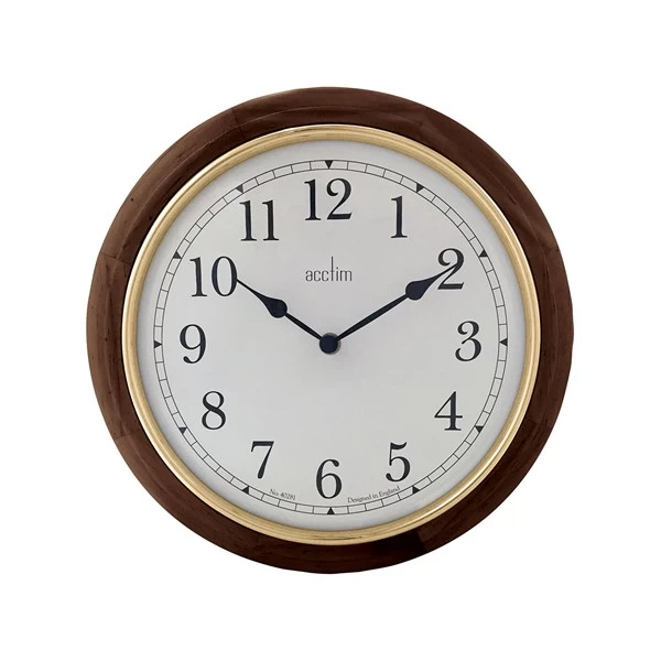 A classic looking Acctim wall clock featuring a dark wooden round case with bevel edge, a gold tone bezel with clear white dial, black Arabic numbers and hands. Quartz battery operated, comes with 1x AA battery, included. Measures 30cm diameter x 4cm deep.