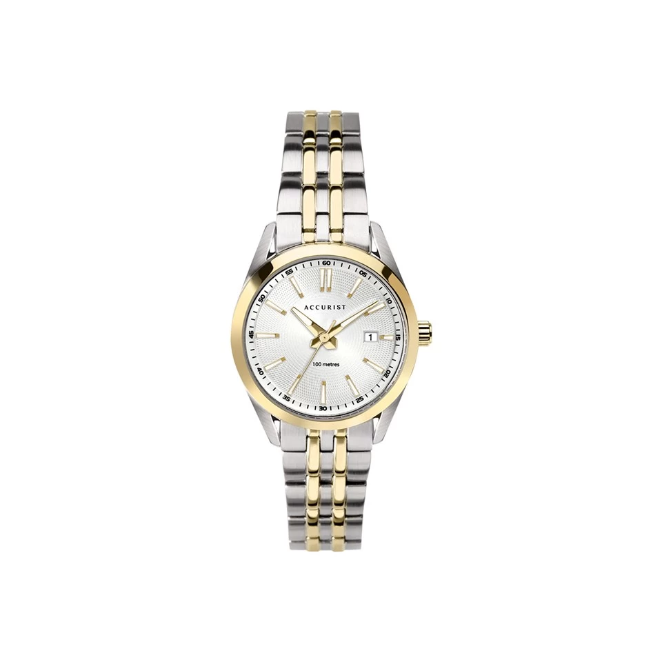 This classic ladies watch from Accurist features a 28 x 8mm stainless steel case with gold tone bezel. The silver dial has gold tone baton hour markers and hands and there is a date display window. Finished with a two tone bracelet with double push button folding clasp. 100m water resistant.