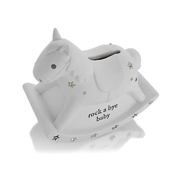 A cute white resin rocking horse money box perfect for the nursery, as a new baby gift or christneing gift. Measures approximately 13 x 7 x 12cm.