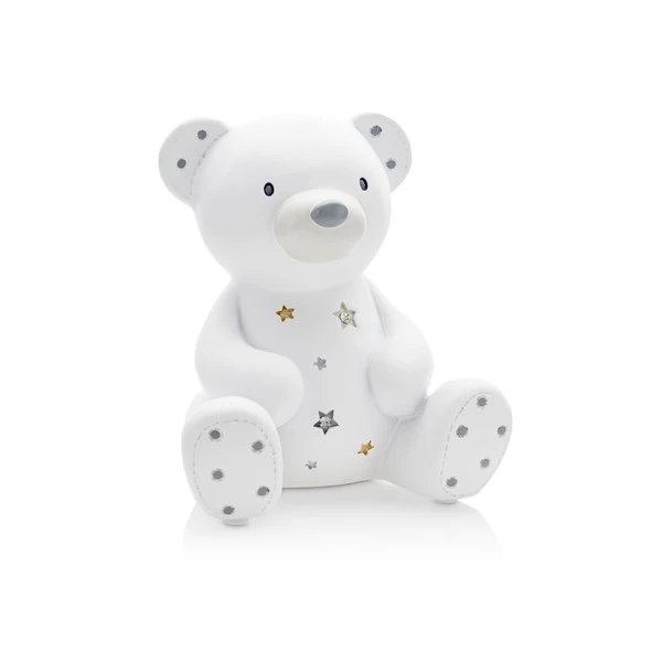 A sweet teddy bear money box that can be filled with coins for a child or baby when they get a little older. Set with stars and crystals for extra details. Sits 12cm tall.