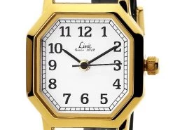 A sport style for this automatic movement watch, so kinetic energy powers up the movement, with a smart matt stainless steel finish for the 46 x 14mm case and 27mm adjustable bracelet, with its entirely integrated push button clasp. The visible movement is edged with black, making the gold tone/luminous hour bars and three hands entirely visible, the second hand tipped in red, all protected by sapphire glass. Water resistant 100m.
