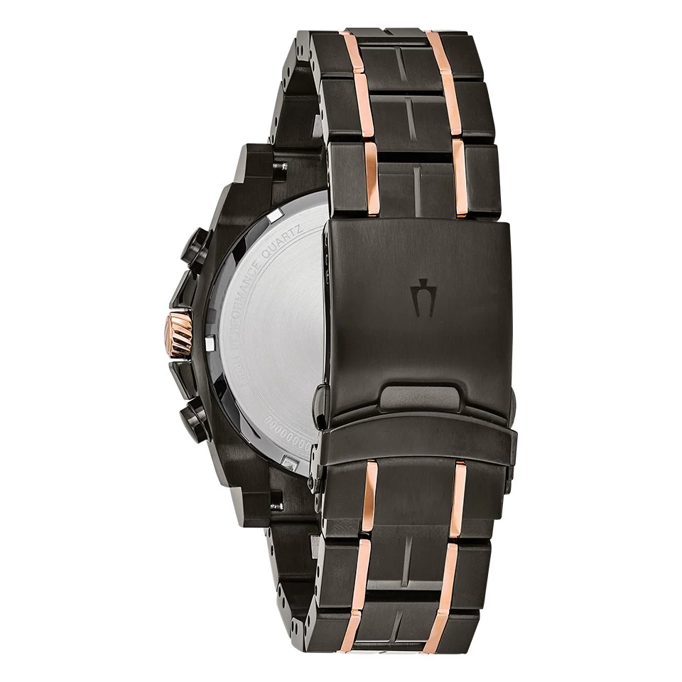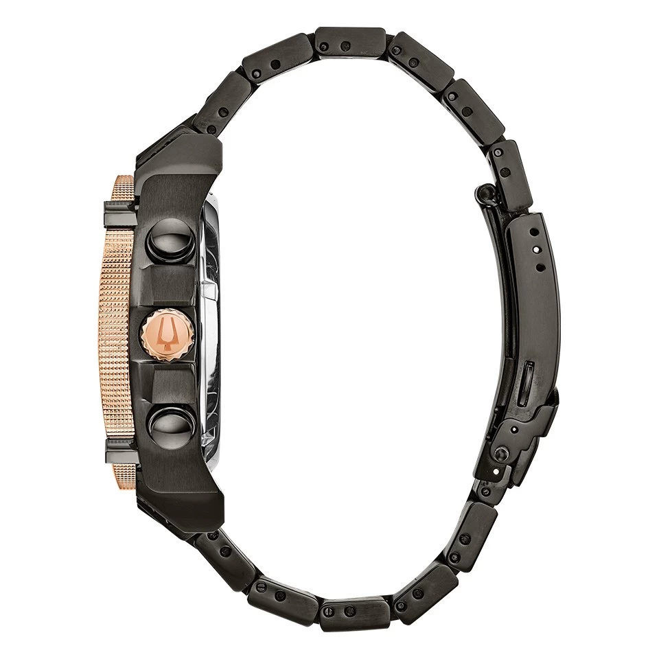 This truly impressive Bulova Precisionist watch is designed to stand out from the crowd and features an angular, 46mm wide case finished in a combination of metallic brown and rose gold plated tones. Sat beneath a curved glass, the multi-layered dial is set with diamonds for hour markers and continues with using rose gold tone elements for additional styling. Precisionist 262khz movement for added accuracy along with a water resistance of 300m give this watch a practical edge. Added to this, the bracelet features a second folding section on the clasp allowing it to be worn over a wet suit – very ‘Secret Service’!
