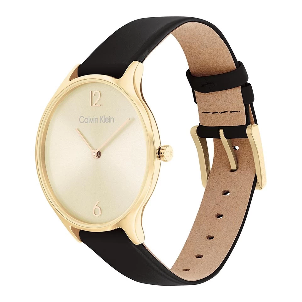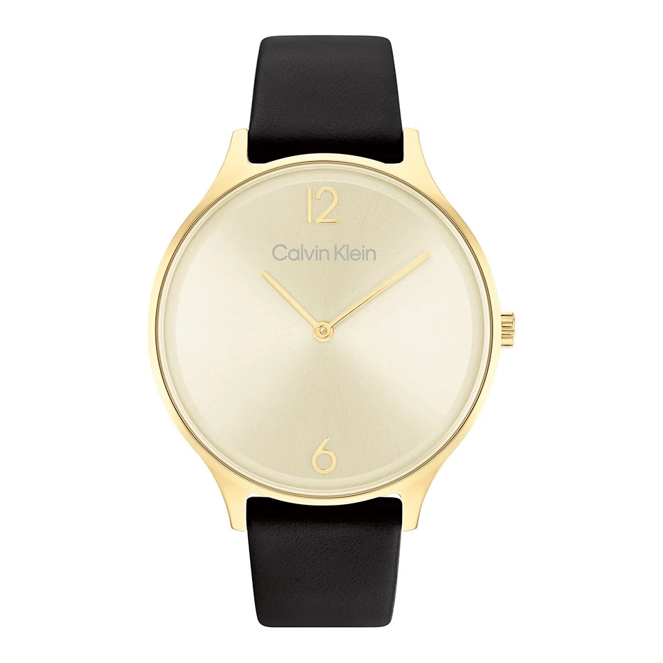A modern watch from Calvin Klein featuring a 38 x 7.5mm gold plated stainless steel case, champagne sunray dial and black leather strap. Perfect to wear for any occasion, 30m water resistant.