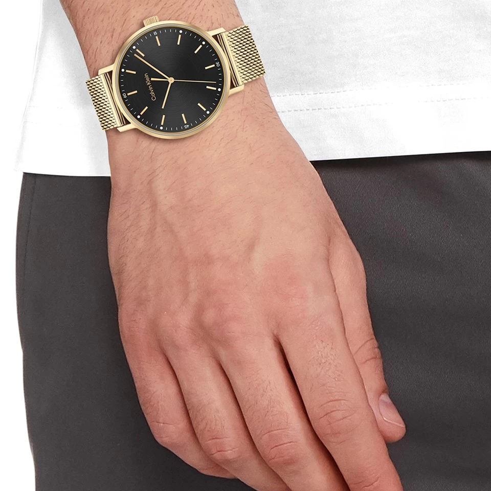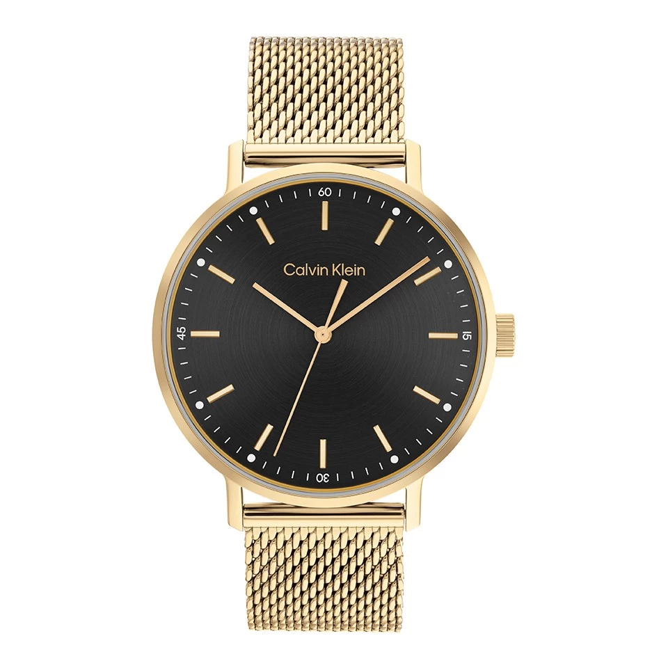 Simple yet stylish, this men’s watch from Calvin Klein combines a gold tone mesh bracelet and 42mm case. The bold black dial adds a depth to the design and is contrasted beautifully by the gold tone hands and hour markers. Water resistant to 30m.