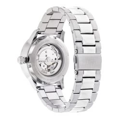 The 42mm stainless steel case hold a striking black dial with silver tone hour markers and visible automatic movement. The matt and polished bracelet adds another layer of style and is finished with a folding clasp. Water resistant to 50m.