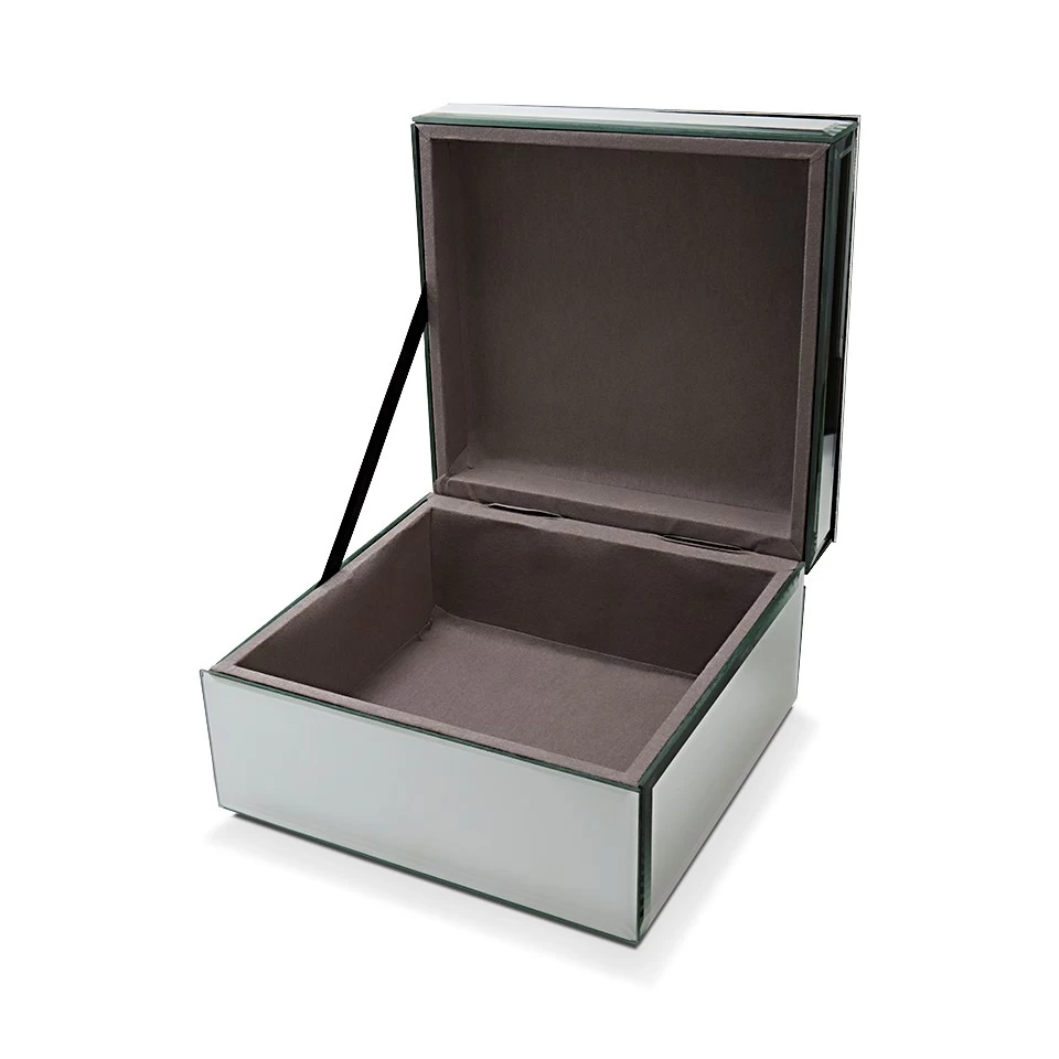 A lovely square mirrored trinket box with a sparkly crystal set inner square. Lift the lid to reveal a large, lined single space for all your precious bits and bobs. Measures 14 x 14 x 8cm.
