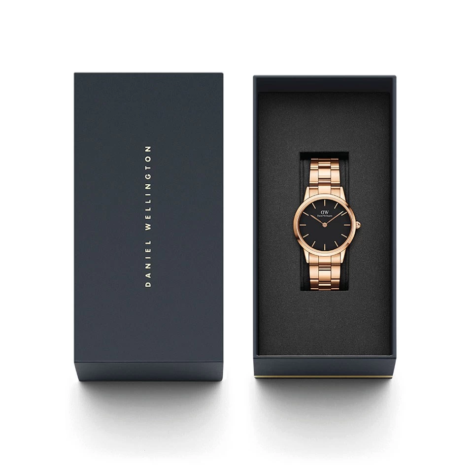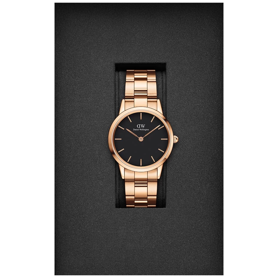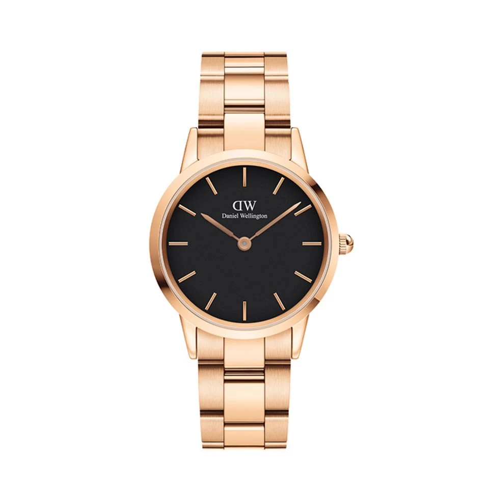 A modern take on a classic design, the Iconic Link watch from Daniel Wellington is the revelation behind years of meticulous craftsmanship. The timepiece features a luxurious rose gold plated metal bracelet with three-piece links; each segment is comprised of solid steel, crafted pieces in an elegantly tapered form, ensuring a seamless transition from case to clasp. The distinctive and sculptural lines of the raised midpiece blend effortlessly with the 32 x 8mm case, as the signature twelve index black dial with rose tone baton hour markers and hands takes on a renewed, modern silhouette. 30m water resistant.