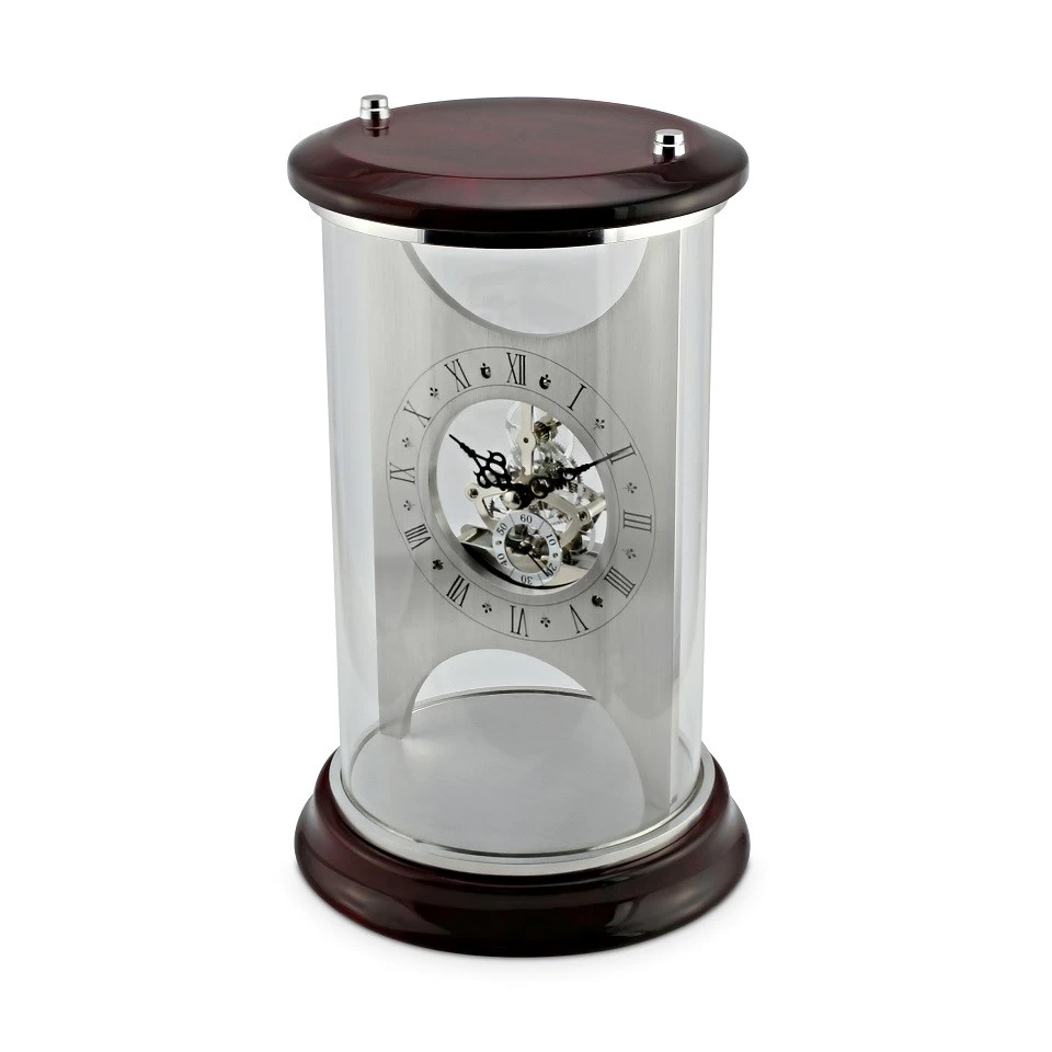 This superb new addition to the range of David Peterson skeleton clocks features piano finish red mahogany top and bottom, brushed aluminium finish clock face, with skeleton movement and glass case. This clock will finish off any modern room. Measures 28 x 17.5cm.