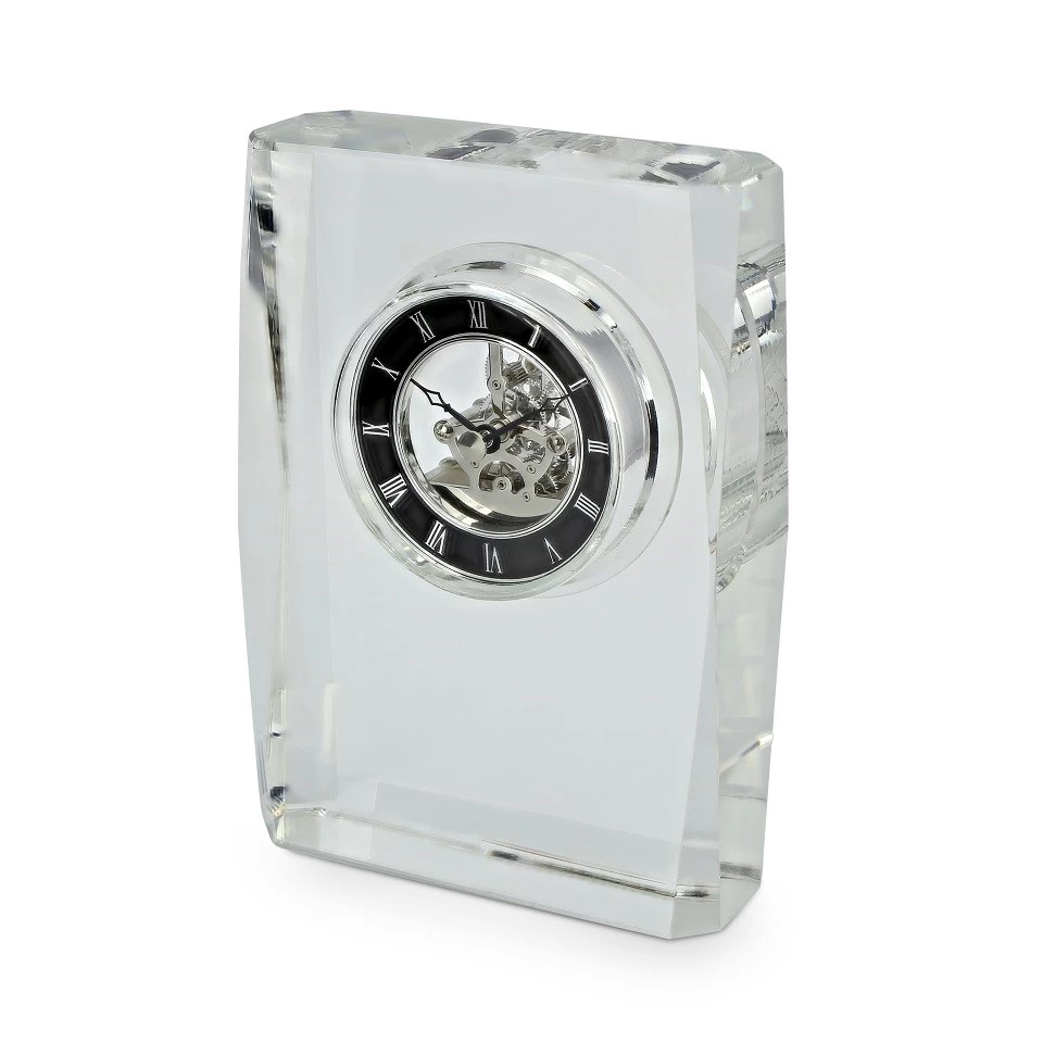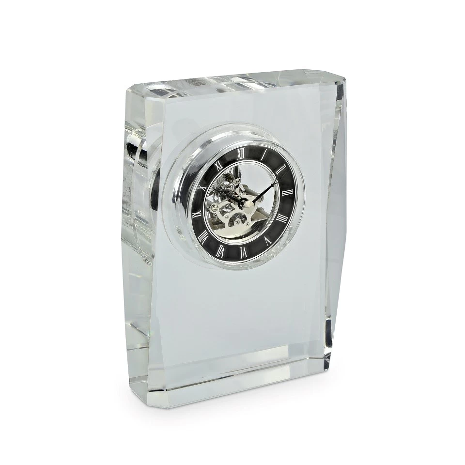This elegant rectangular quartz mantel clock in K9 crystal from David Peterson features a skeleton design with white roman numeral hour markers on a black surround. The edge has chamfered to give an interesting look. Supplied beautifully gift boxed. Measures 12 x 8.5 x 4cm.