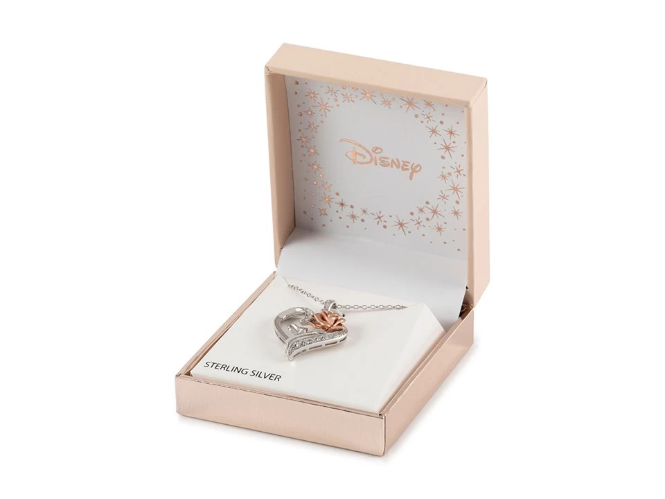 A stunning Disney necklace featuring a large, 20mm open heart with a beautifully detailled rose plated rose and sparkling cubic zirconia stones. A stone set pendant loop finishes the design, strung from an 18″/45.5cm fine silver belcher chain. Packaged in an official Disney gift box.