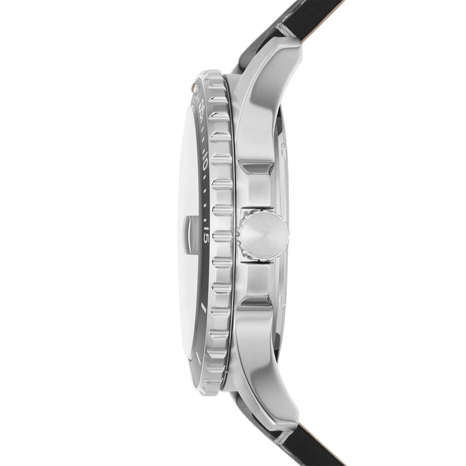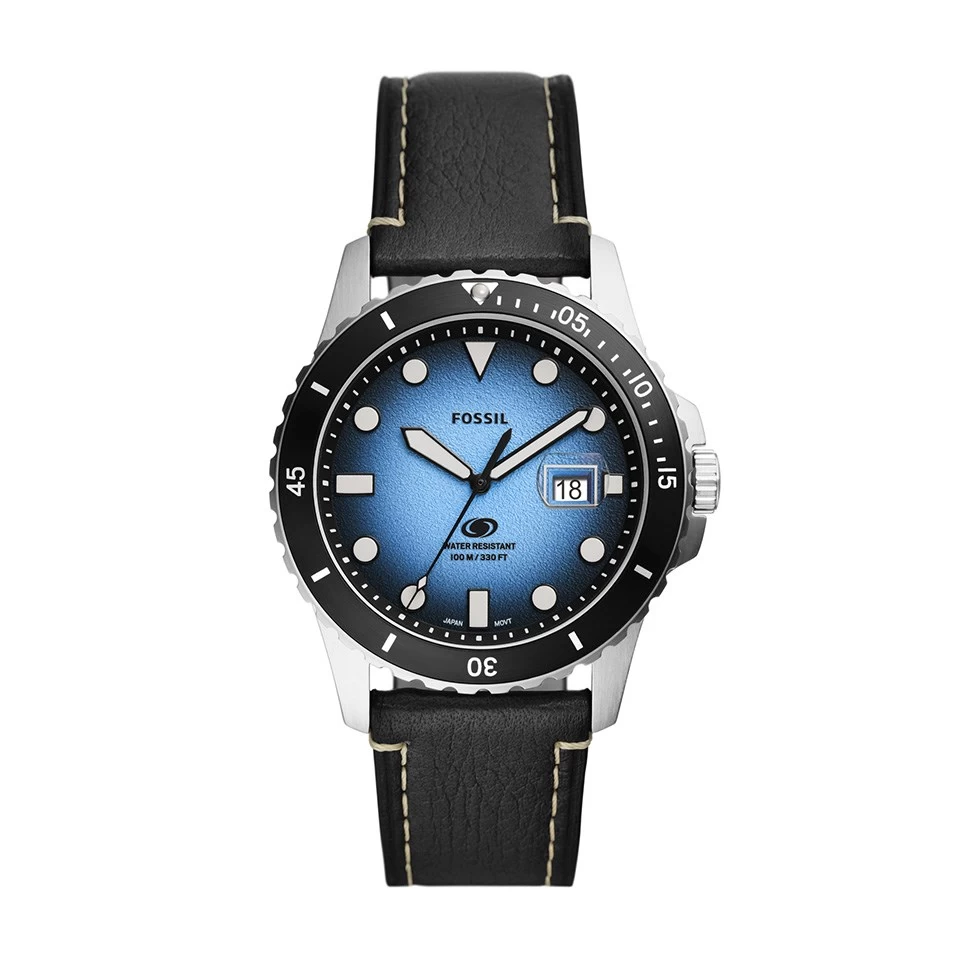 With a gradient blue-black dial, this attractive men’s Fossil Blue watch has everything you need: luminous hands and hour markers, a date window, black rotating bezel and a stitched black eco-leather strap with buckle. 100m water resistant.