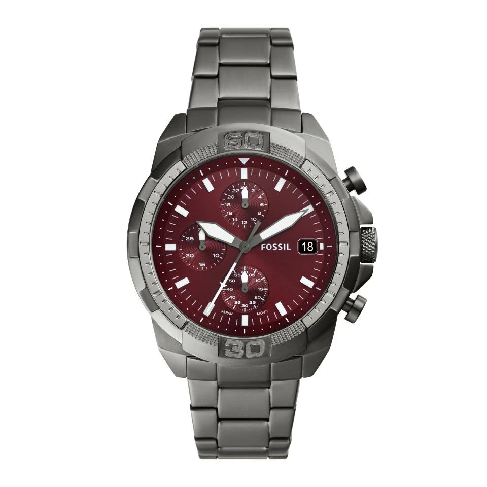This smart Fossil Bronson Chrono iboasts an elegant smoke grey IP bracelet and complementing burgundy chronograph dial covered with mineral glass. With a 44mm case, handy date window at 3 o’clock and easy to read white hands and hour markers, this Fossil watch is a real winner. 50m water resistant.