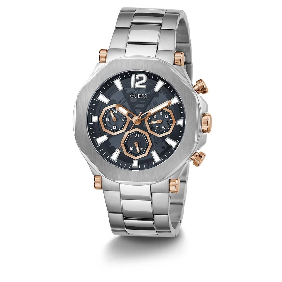 Keeping you on the ‘Edge’ of fashion, this men’s watch from Guess features a 46mm octagonal stainless steel case design with cut-thru details on a blue multi-dial with gold tone accents. Finished with a sleek bracelet with double push button folding clasp. 50m water resistant.