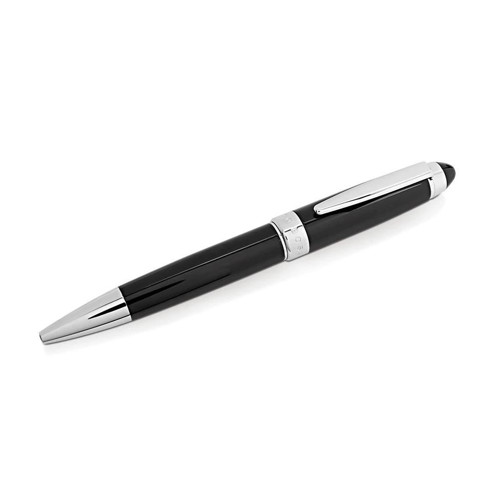 A stylish black and Chrome ballpoint pen from Hugo Boss. Twist action mechanism with a quality weight and feel. Presented in a Hugo Boss case.