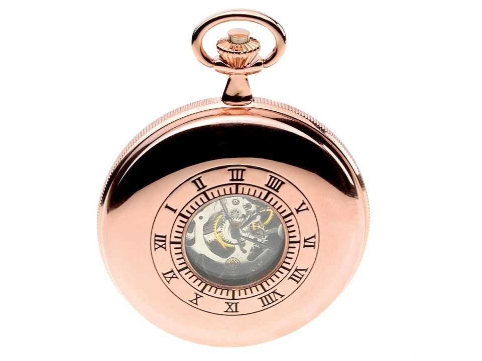 This Jean Pierre double half hunter pocket watch boasts a highly decorative hinged front and back opening rose gold plated case, black roman numerals and hands, a 17 jewelled mechanical movement and a classic white skeleton window dial. Finished with a traditional rose gold plated Albert chain.