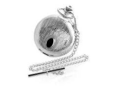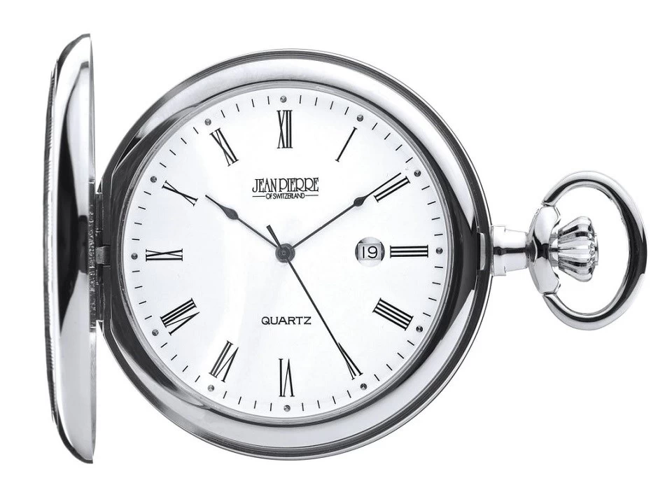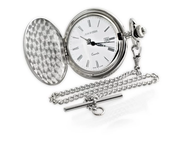 A traditional Jean Pierre hunter pocket watch with a quartz calendar movement, a clear white dial, black roman numerals and hands plus a useful date window. Finished with a beautfully decorated chrome plated case with matching Albert chain.