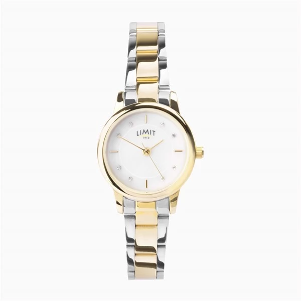 A petite Limit watch with a gold plated case, two tone steel bracelet, clear white dial and crystal set hour markers.