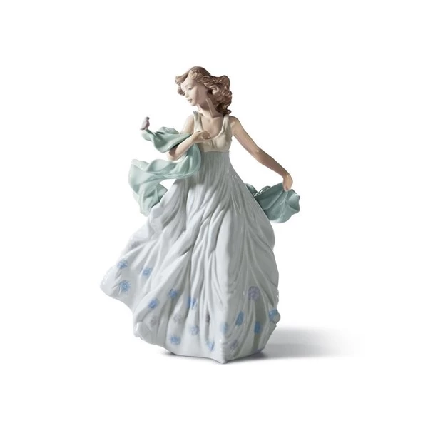First released in 1995 and designed by Lladró sculptor Regino Torrijos, Summer Serenade is a beautifully detailed piece featuring a young lady with a floral dress and flowing green shawl, as she serenades her bird friend. The movement that’s created in her clothing and hair is a true testiment to these talented Lladro artisans. Stands 32 x 21cm, made in Spain.