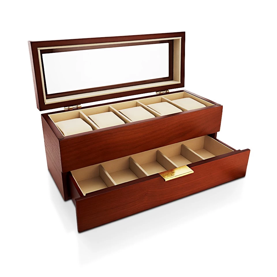 A stunning wooden beech watch box from Mele & Co suitable for holding up to ten watches – perfect for avid watch collectors. Measuring 30.5 x 11 x 13.5cm, the top layer holds five watches which are visible through the glass lid, whilst the other five watches are held securely within the pull out drawer. Rotate your favourite watches so you can take turns viewing them!