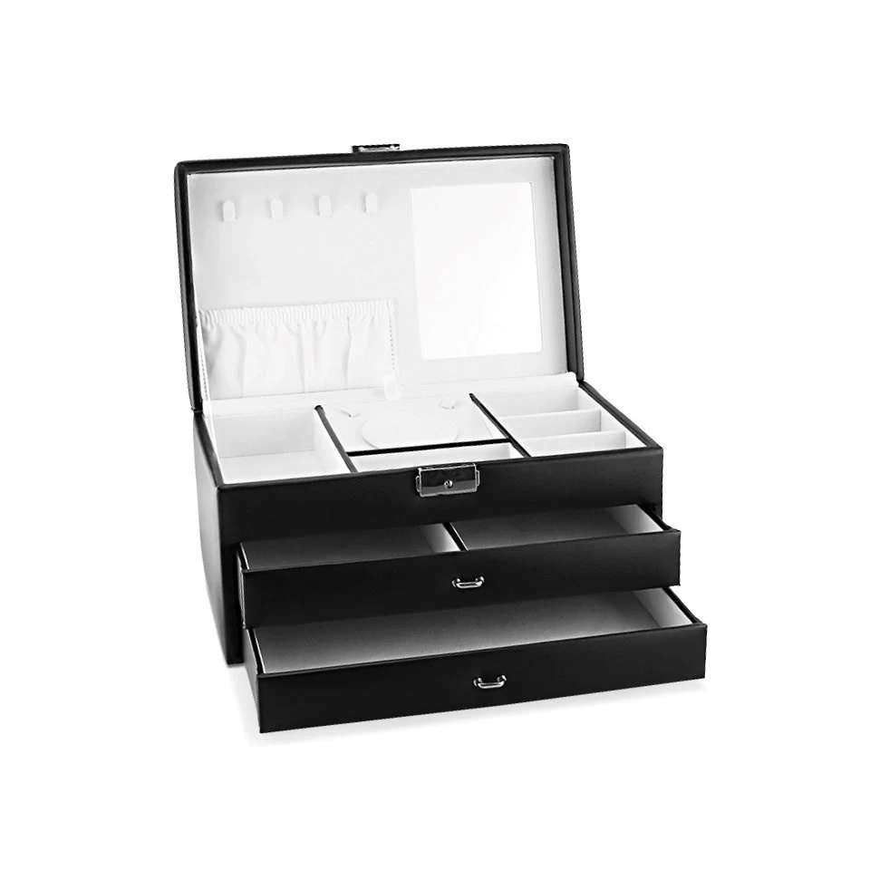 A large, black bonded leather jewellery box with a mirror, necklace hooks and elasticated pockets in the lid. The top section includes earring straps, ring rolls, compartments and a lift-up necklace/bracelet holder. Fully lined with white velveteen and a loackable top section. Approximate size 31 x 19 x 16.5cm.