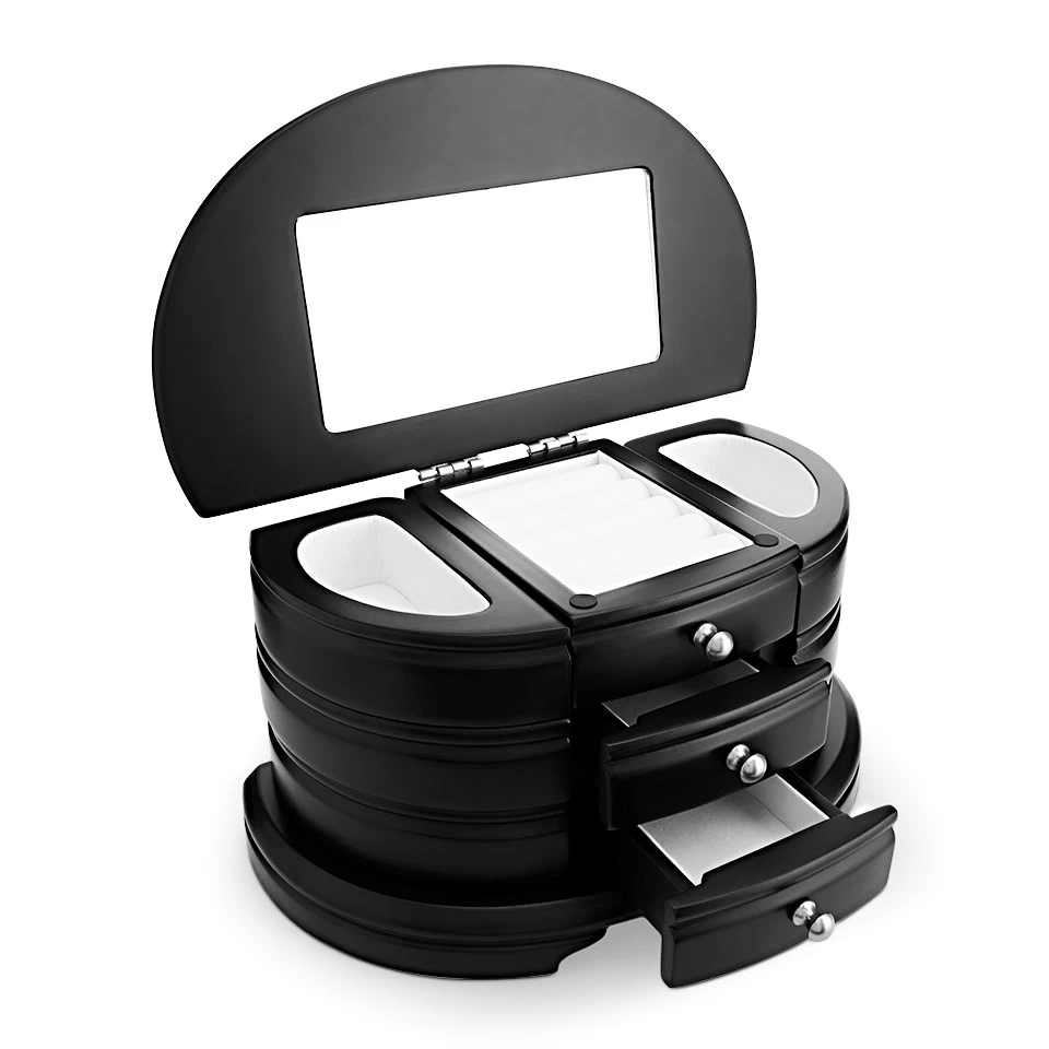 A fantastically designed rounded black wooden jewellery box with a satin finish and plenty of storage options for all your treasured possessions. The lid lifts to reveal a vanity mirror and two compartments for earrings and rings, with two pull out drawers below for extra space. The side compartments cleverly (and uniquely) swivel to reveal yet more small side options for additional bits and bobs. Aesthetically and ergonomically pleasing. Measures 24 x 13 x 13cm.