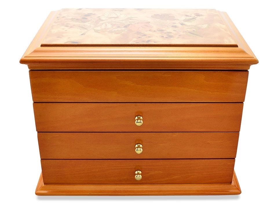 Lift the floral patterned lid to reveal a dressing mirror and subdivided area for smaller pieces of jewellery such as beads, earrings and rings. Below three drawers allow for the safe storage of larger items of jewellery or watches. Approximate size 26 x 18 x 20.5cm.