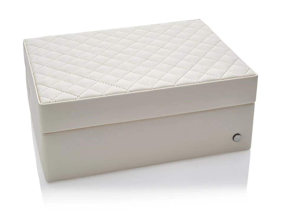 A premium looking jewellery box with a stitched design lid. The box opens to reveal a dressing mirror, small sections for smaller pieces and section below for rings and larger elements. Approximate size 25 x 19 x 10.5cm.