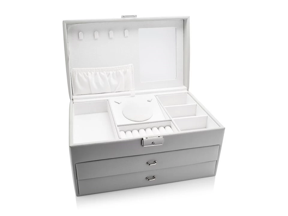 This lovely grey bonded leather jewellery box is fully lined with white veleveteen and accented with silver hardware. It boasts two drawers; the top with two compartments split vertically and the lower drawer as one big compartment perfect for your larger bits and bobs. It also boasts a mirror, necklace hooks, earring straps, ring rolls, compartments, a lift up necklace and bracelet holder and an elasticated pocket. Lockable and measures 31 x 19 x 16.5cm.