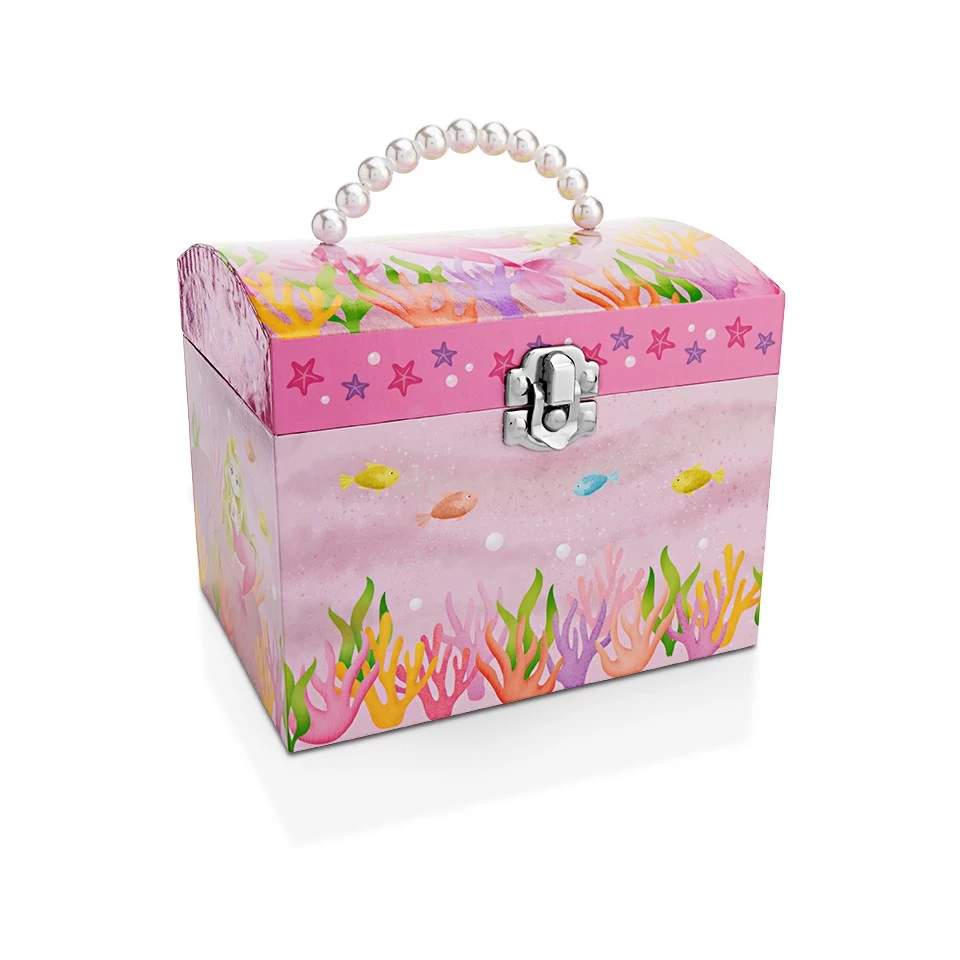 A fun jewellery box for little ones with an under the sea, mermaid scene plus a pretty faux pearl handle. Open the lid to reveal a lift out tray and space underneath for larger items, plus a rotating mermaid who turns to the tune of Für Elise by Beethoven when wound up. Measures 17 x 13 x 14cm.