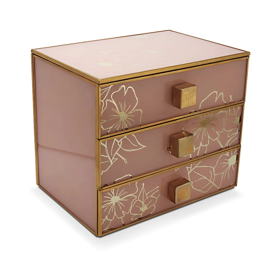 A truly stunning floral jewellery box that would complement pink, green, blue and gold tones within a room. Measuring 16.5cm wide x 11.5cm deep x 14cm tall, it boasts three drawers all with grey velveteen lining, perfect for keeping your bits and bobs safe.